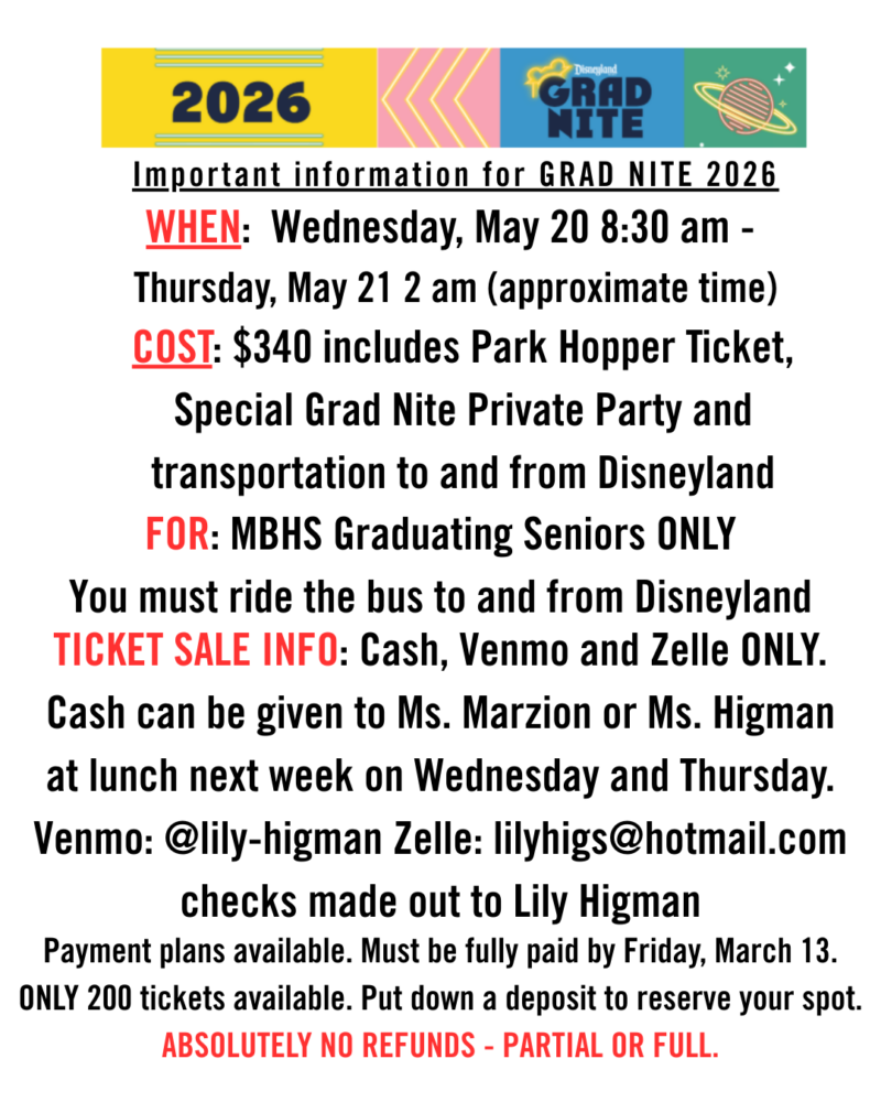 To donate money, fill out this donation form and write a check to Mission Bay High School, with the Class of ‘26 written on the memo line. Drop it off at the front office in the direction of our class advisor (Ms. Filamor). To donate goods, complete this donation-in-kind form and drop it off at the front office in the attention of the school’s financial clerk (Mr. Luong).