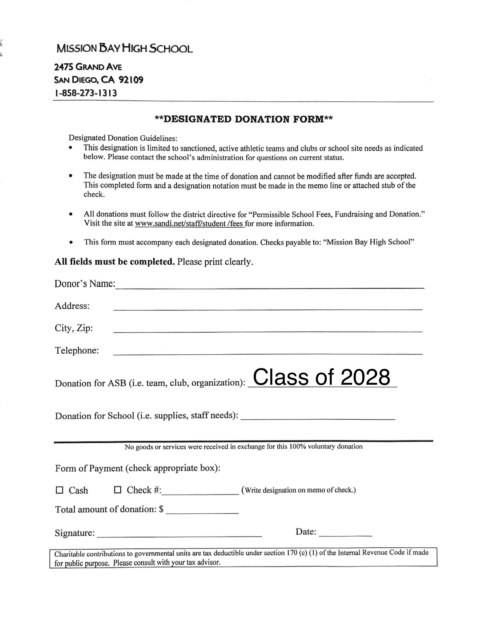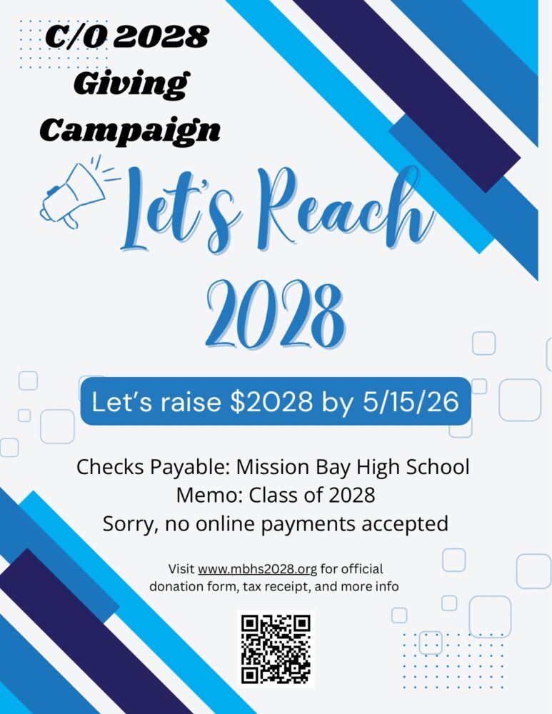 To donate, fill out this donation form and write a check to Mission Bay High School, with the Class of 2028 written in the memo line of the check. Drop it off at the front office or mail it in to the school: